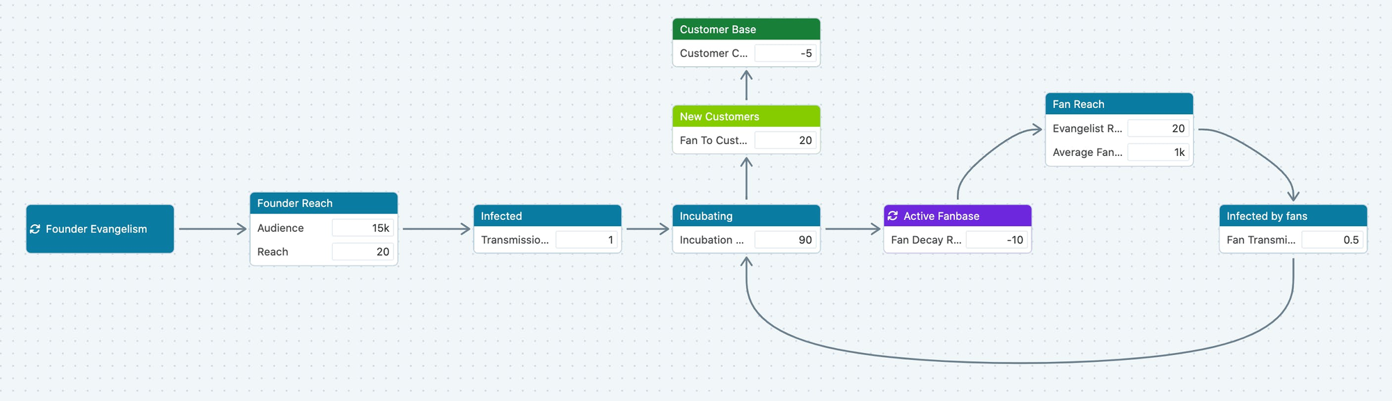 This model says if I as a solo evangelist tell my audience on Twitter of 15k folks about Summit in a compelling way once per week (solid!) and reach 20% of them, and 1% of them get infected with the idea, and yet it still takes 90 days to nurture that idea into fandom, and those disciples tell their audiences (with an average size of 1k followers, reaching 20% also), and their transmission rate is half a percent (they're not as good as me), and those new disciples' disciples enter the fan base, and the fan base loses 10% of its population each month: