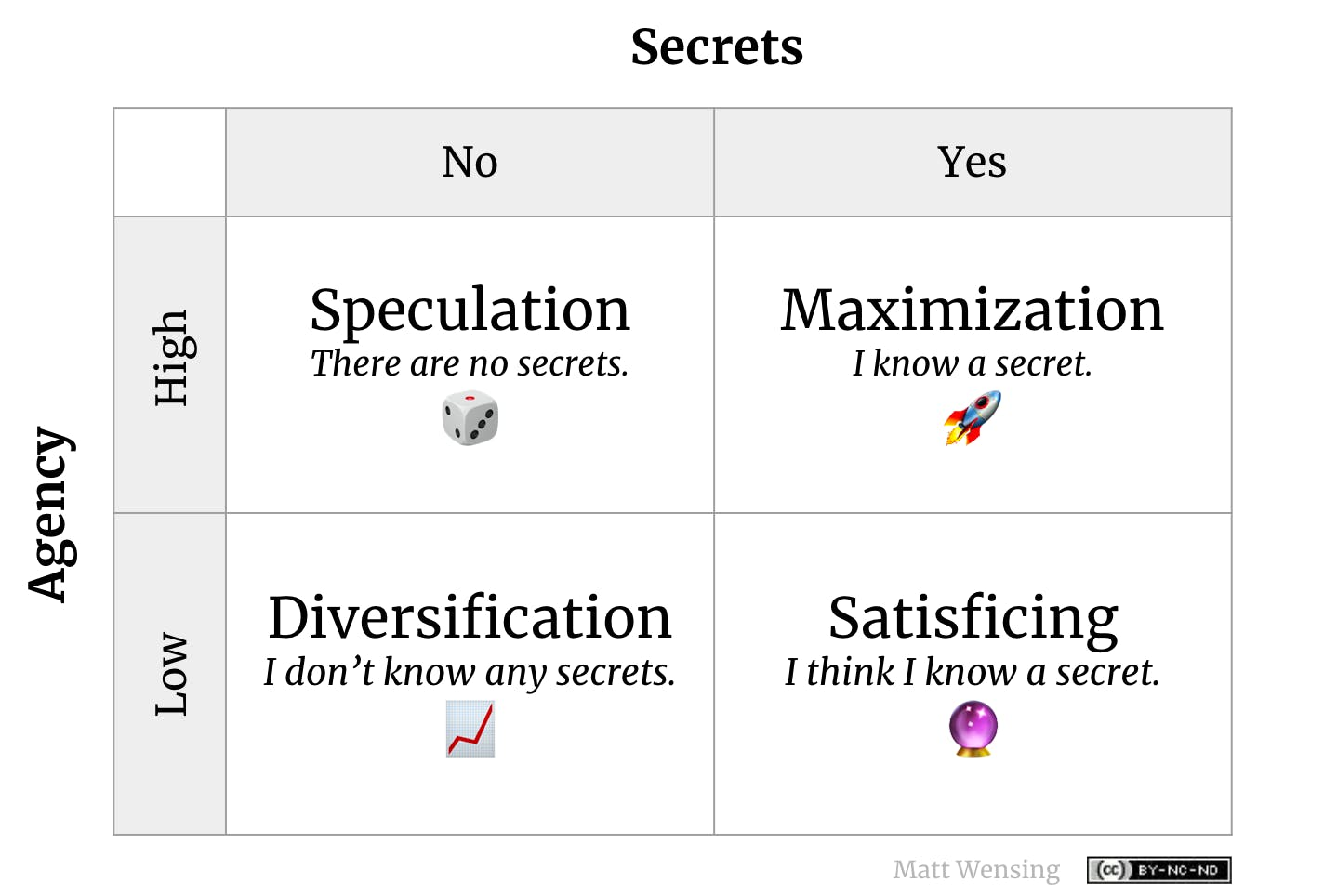 Our minds steer us towards a strategy for investing our resources — time, energy, and money, based on how we feel, rightly or wrongly, about (1) our possession of secrets and (2) our level of agency. That assessment may be wrong, and being right doesn't mean we'll win (risk never goes to zero), but our perception of our place against these dimensions heavily influences how much of our health and wealth we're willing to invest into an opportunity.